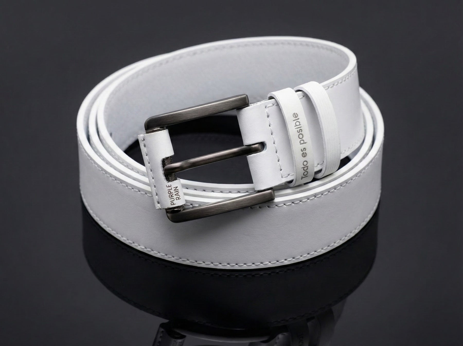 Un cinturón confeccionado en 100% cuero vacío de tono blanco, seleccionado por su durabilidad y textura natural. Su diseño estructural incorpora una doble costura central de hilo reforzado en negro y herrajes metálicos de alta gama con acabado negro mate anticorrosivo. Incluye un estuche cilíndrico con el logo "Purple Rain"