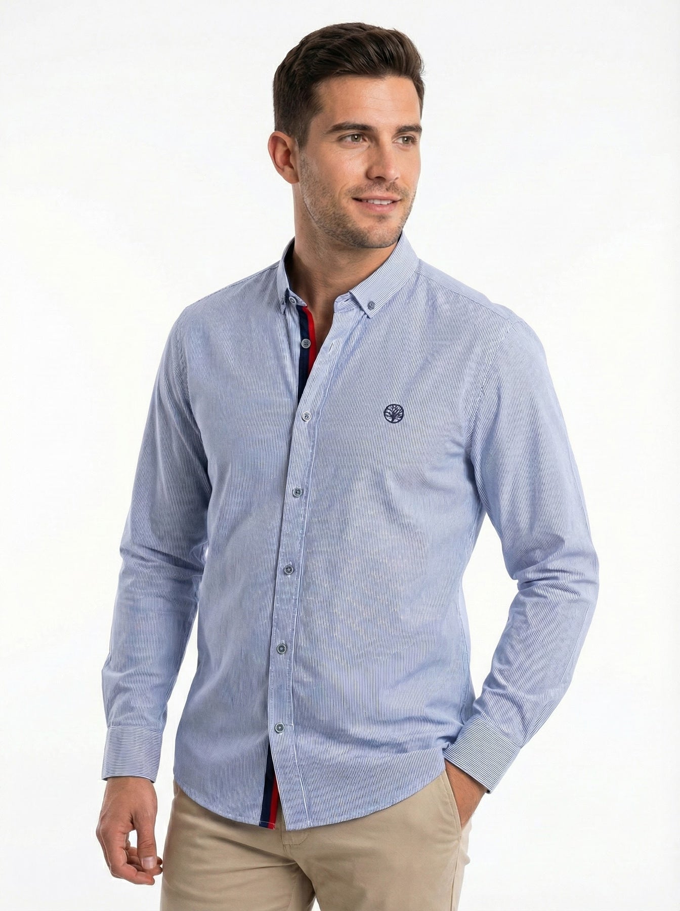 Camisa de manga larga confeccionada en algodón, con un corte slim que estiliza la figura. Presenta una elegante textura de rayas verticales muy finas y un logo bordado a la altura del pecho. Los detalles distintivos incluyen un cuello button-dow.