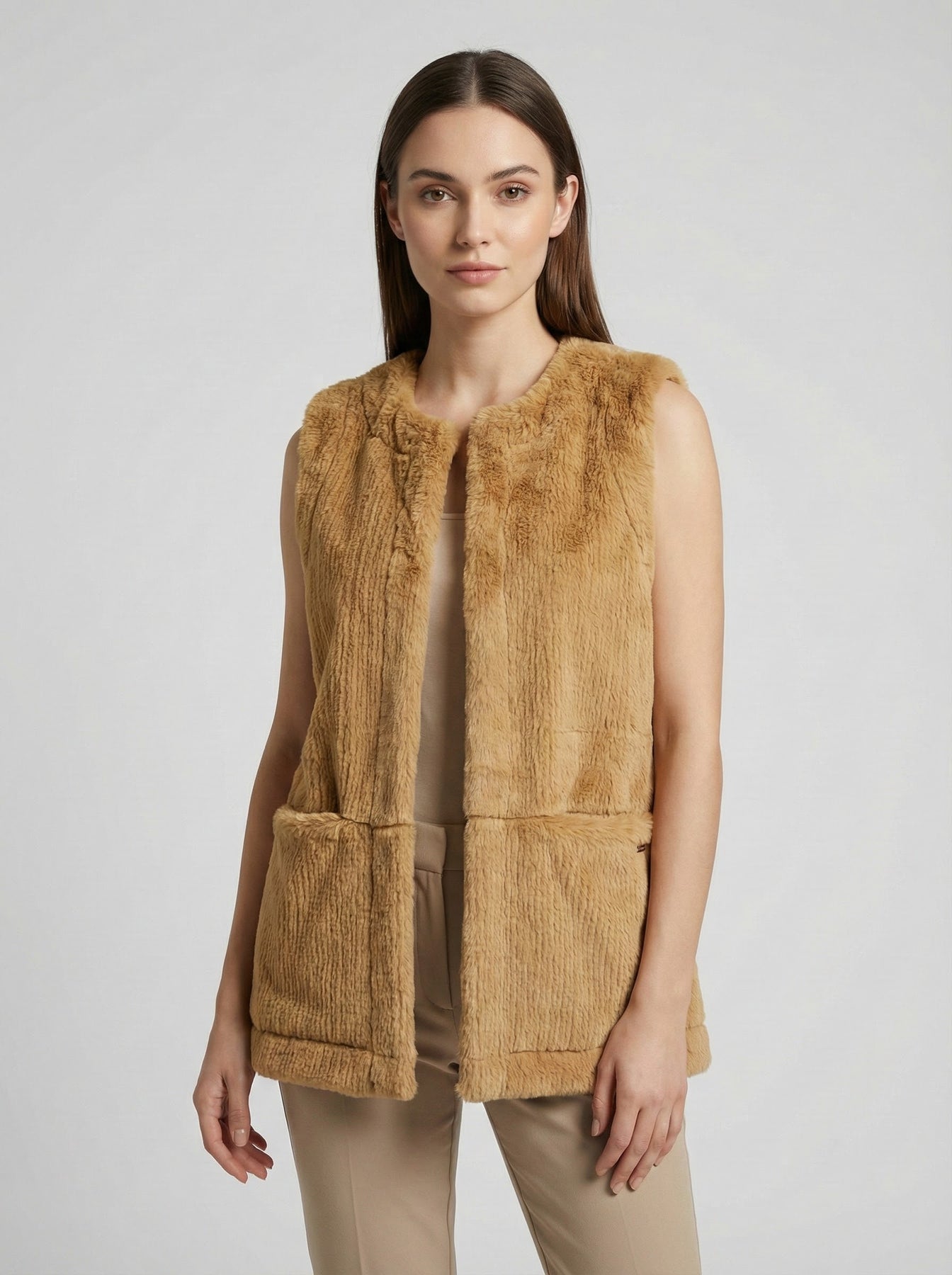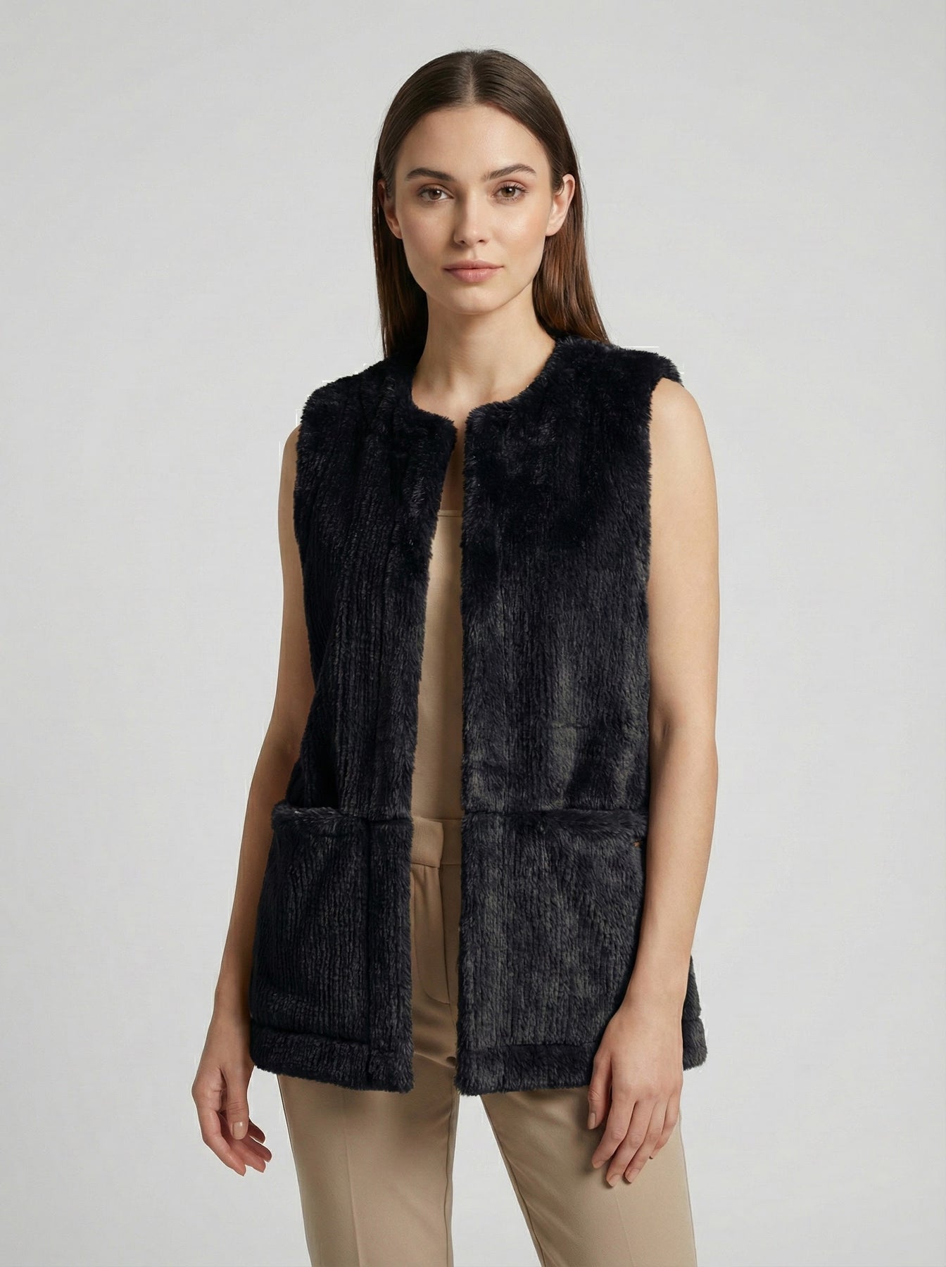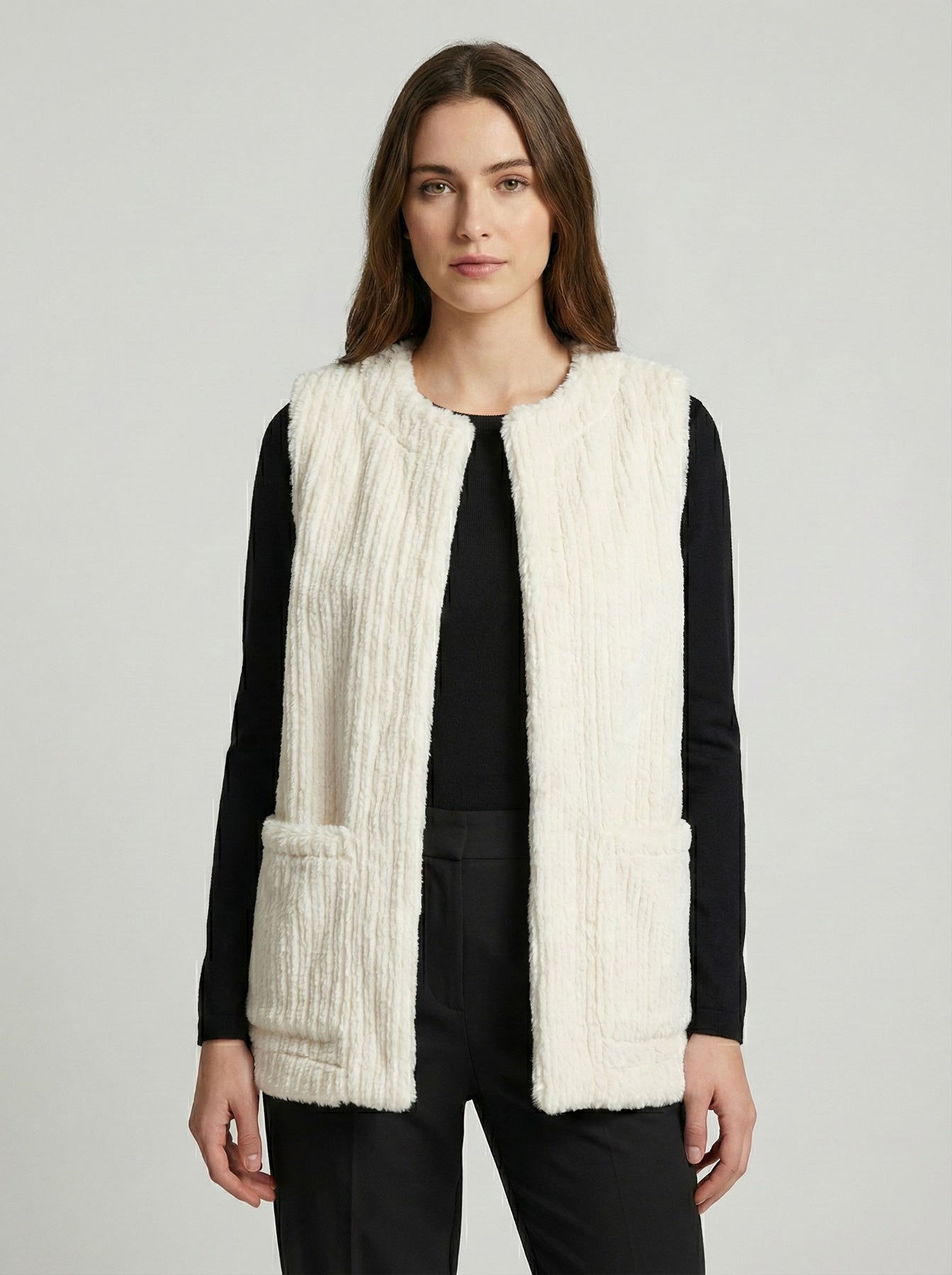 Exclusivo chaleco de textura peluche. A diferencia de las opciones sintéticas convencionales, esta pieza está confeccionada en 100% algodón , ofreciendo una suavidad natural inigualable y una transpirabilidad superior. Su diseño minimalista de cuello redondo y corte recto lo convierte en la prenda perfecta para crear capas ( layering ), aportando calidez y un toque "chic" instantáneo sin sacrificar la comodidad.
