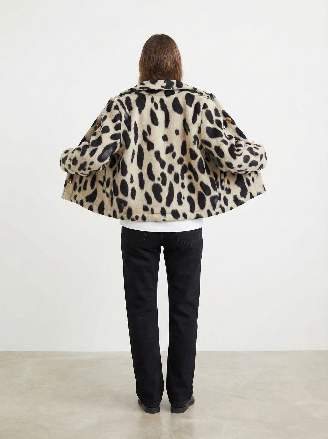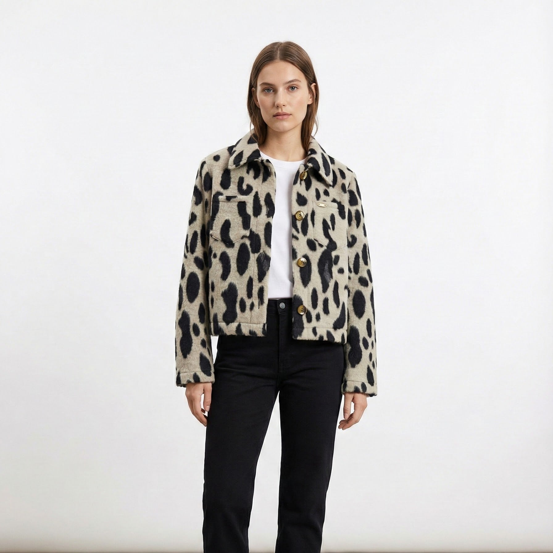 Atrévete con la tendencia animal print. Esta chaqueta con estampado de vaca, confeccionada en 100% poliéster , combina un diseño audaz con la máxima durabilidad y comodidad.