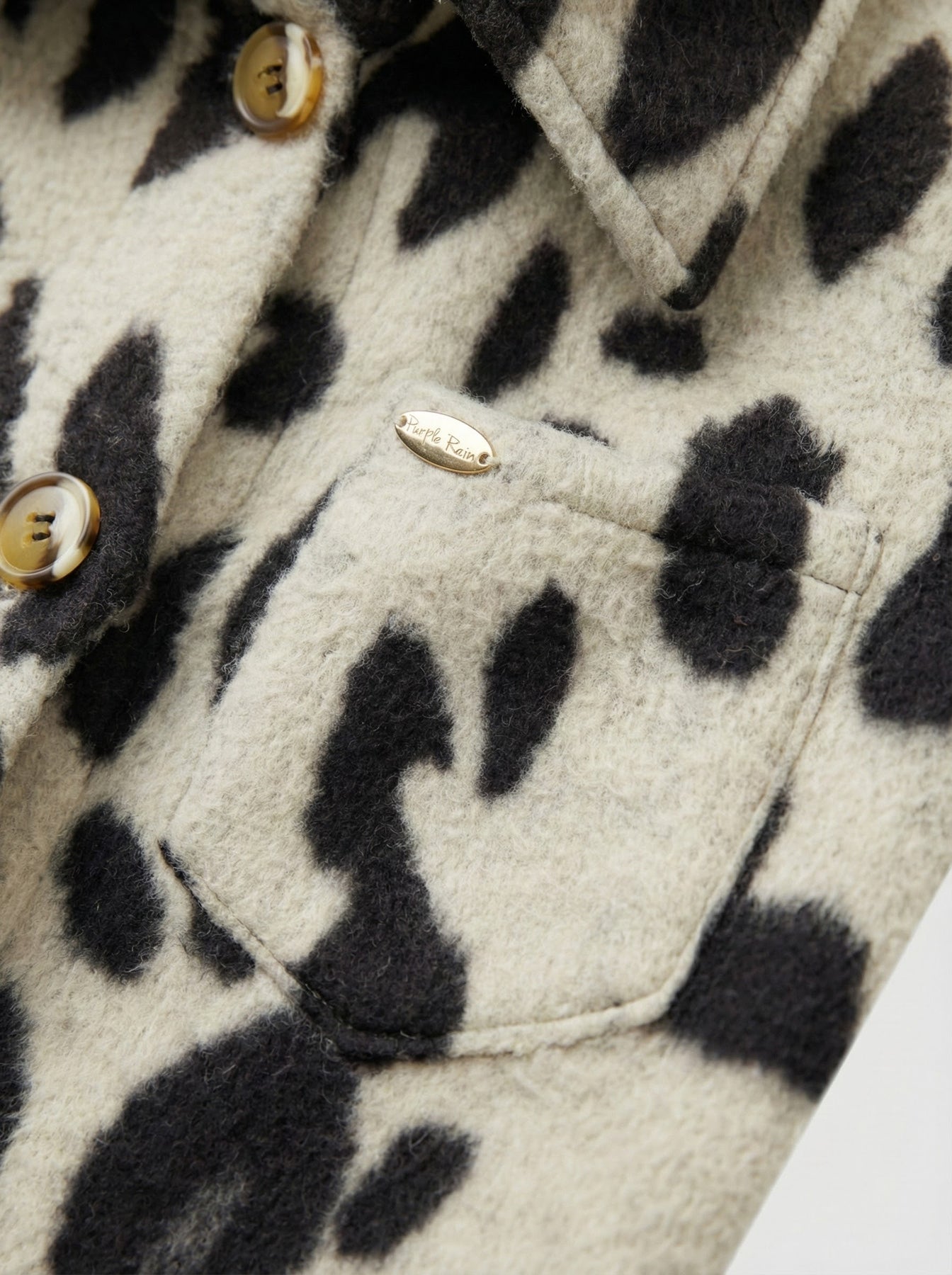 Botones frontales a tono y bolsillos con solapa que añaden funcionalidad y un toque sofisticado, complementado con una sutil placa metálica de la marca "Purple Rain".
