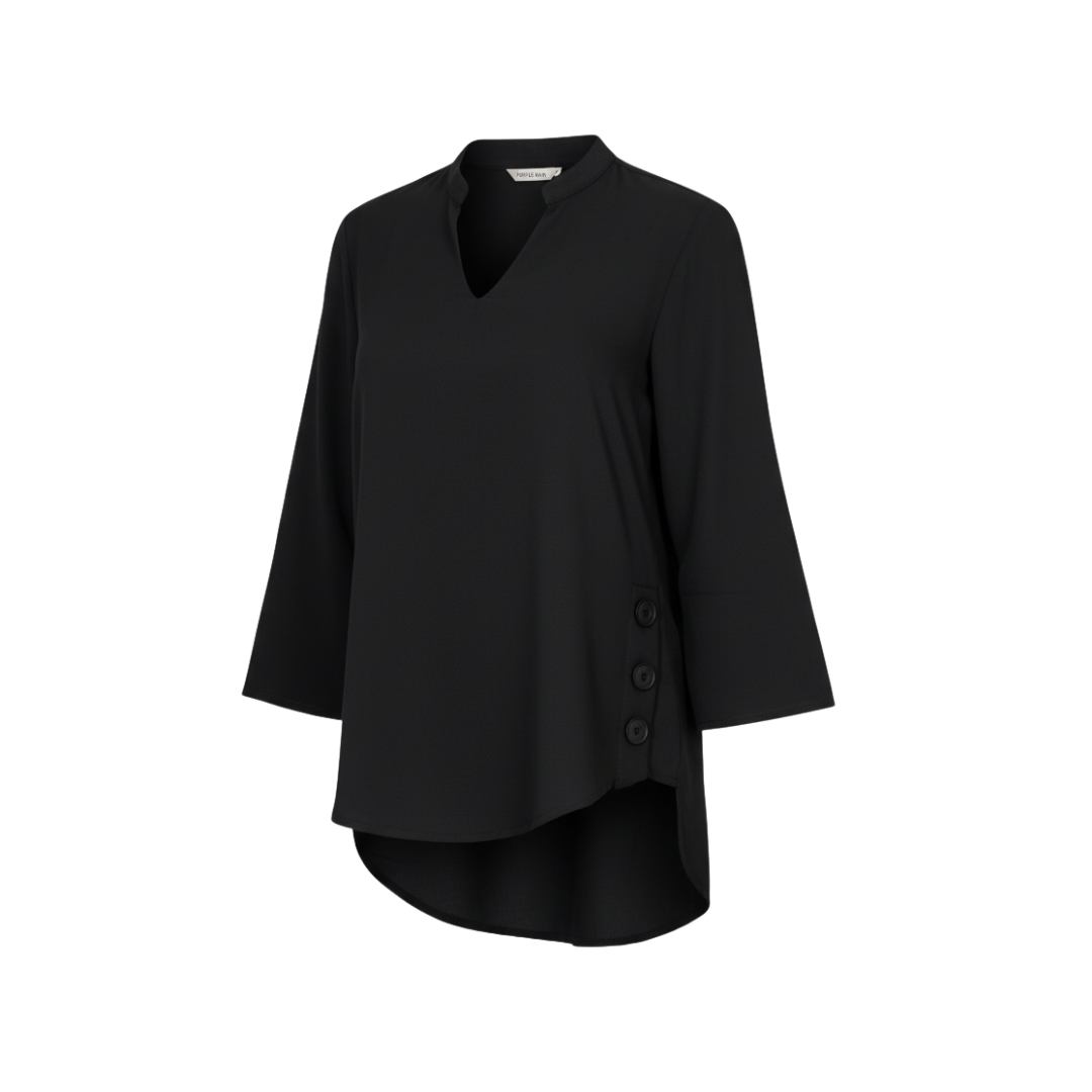 Blusa versátil confeccionada en mezcla de algodón y poliéster que garantiza durabilidad y comodidad. Destaca por su cuello neru con escote en V, que proporciona un acabado sofisticado y favorecedor. El corte amplio ofrece libertad de movimiento sin comprometer la elegancia. Los botones laterales añaden funcionalidad y un detalle de diseño contemporáneo. Cada prenda refleja excelentes estándares de confección y calidad de tela, asegurando una inversión duradera en tu guardarropa.