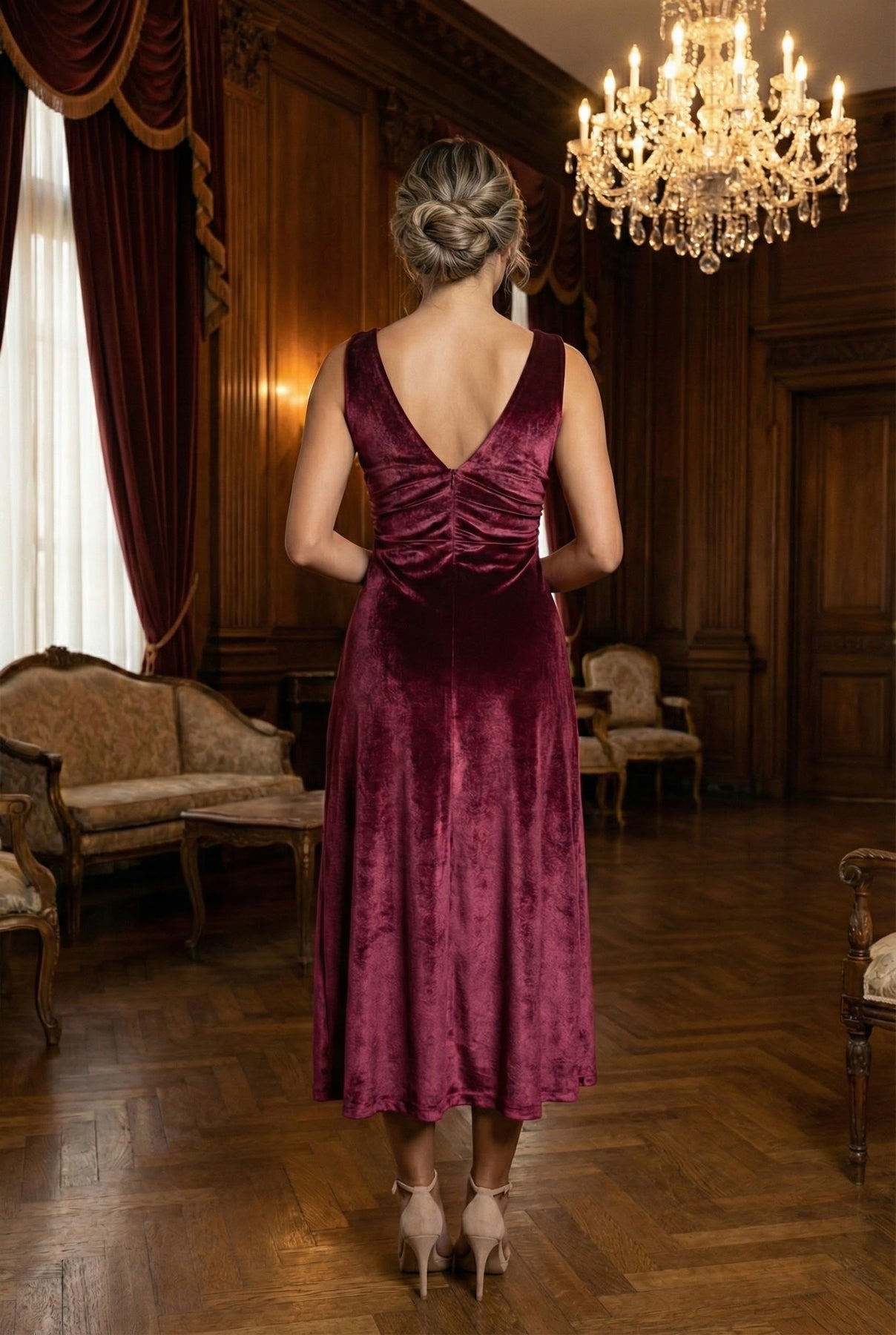 Vestido de Gala en Terciopelo. Confeccionado con una composición premium de 92% poliéster y 7% elastómero, este diseño ofrece un drapeado impecable que realza tu figura mientras proporciona la comodidad que necesitas para brillar toda la noche.