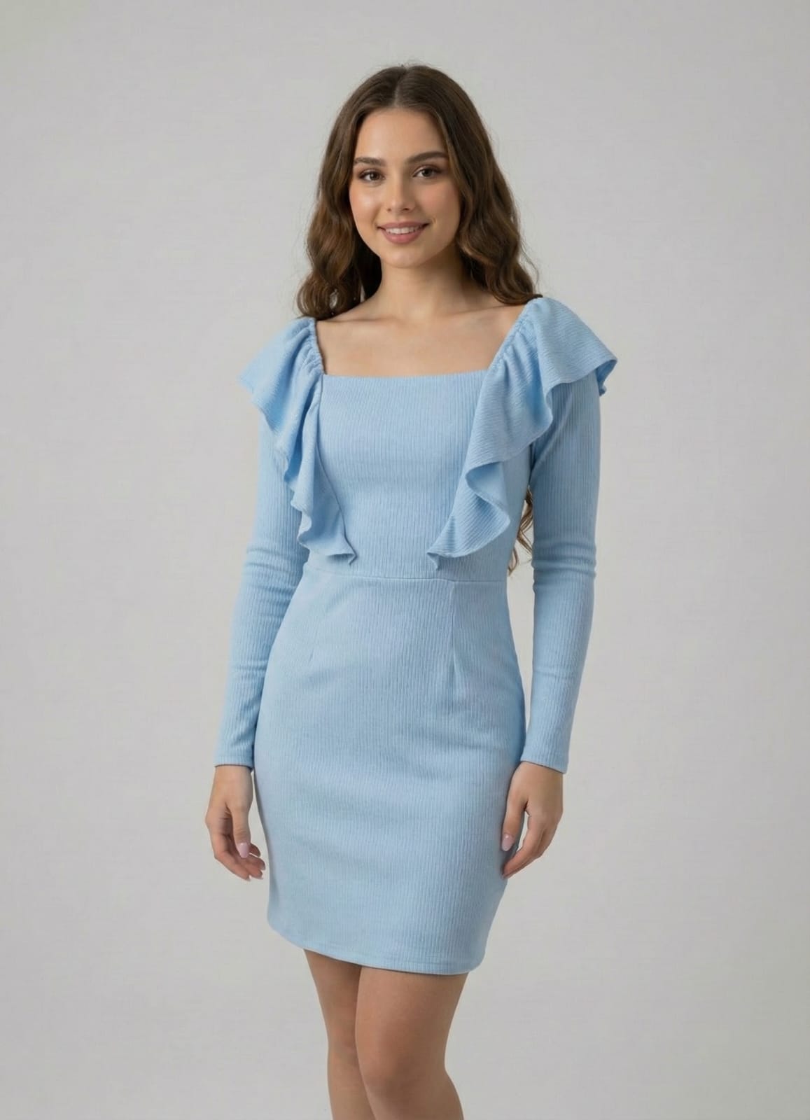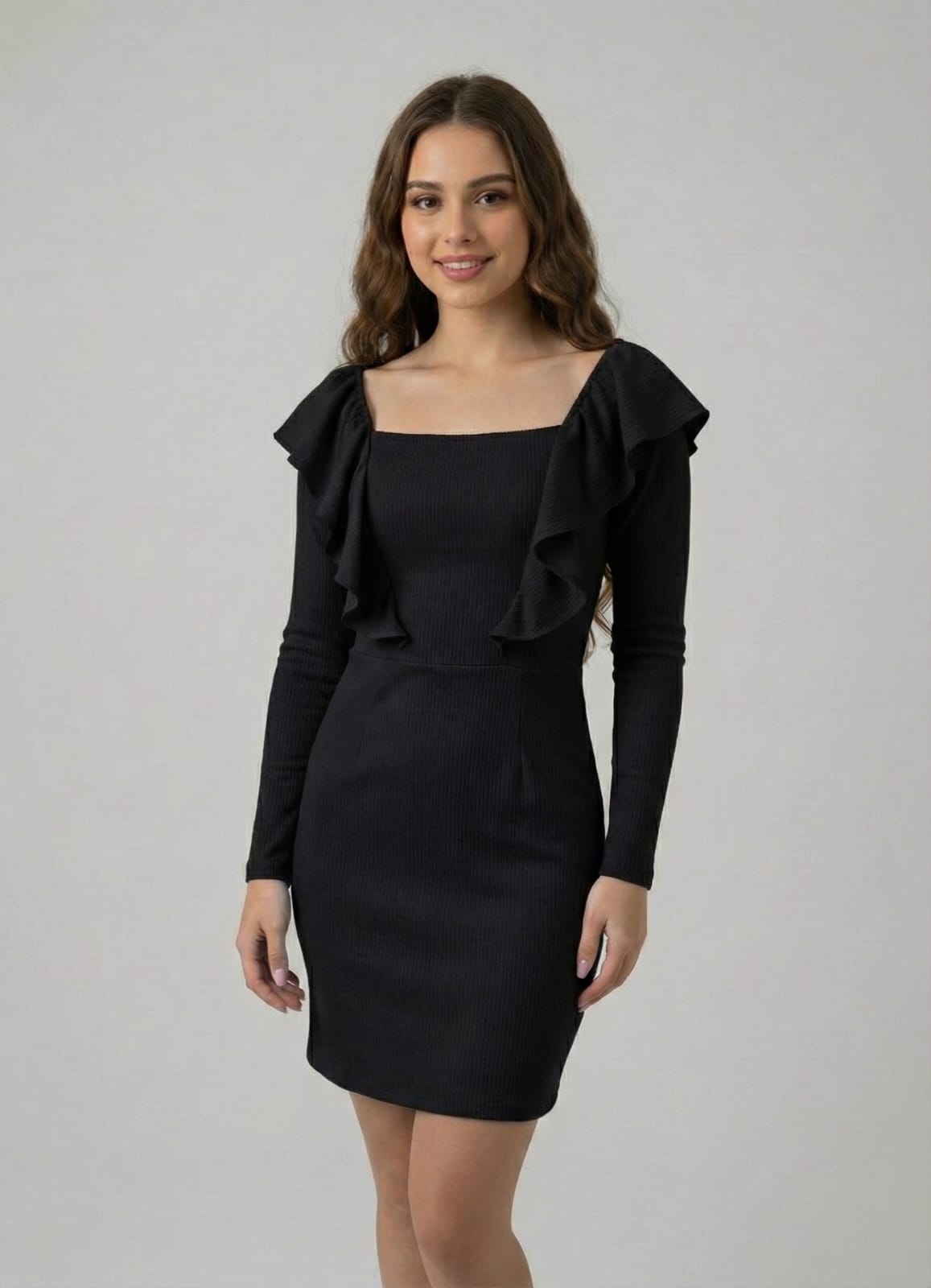 Vestido elaborado en poliéster y spandex, que ofrece una textura suave, buena elasticidad y un ajuste cómodo al cuerpo. Su diseño femenino con silueta definida realza la figura, brindando un look elegante y versátil, ideal para ocasiones especiales o eventos casuales.